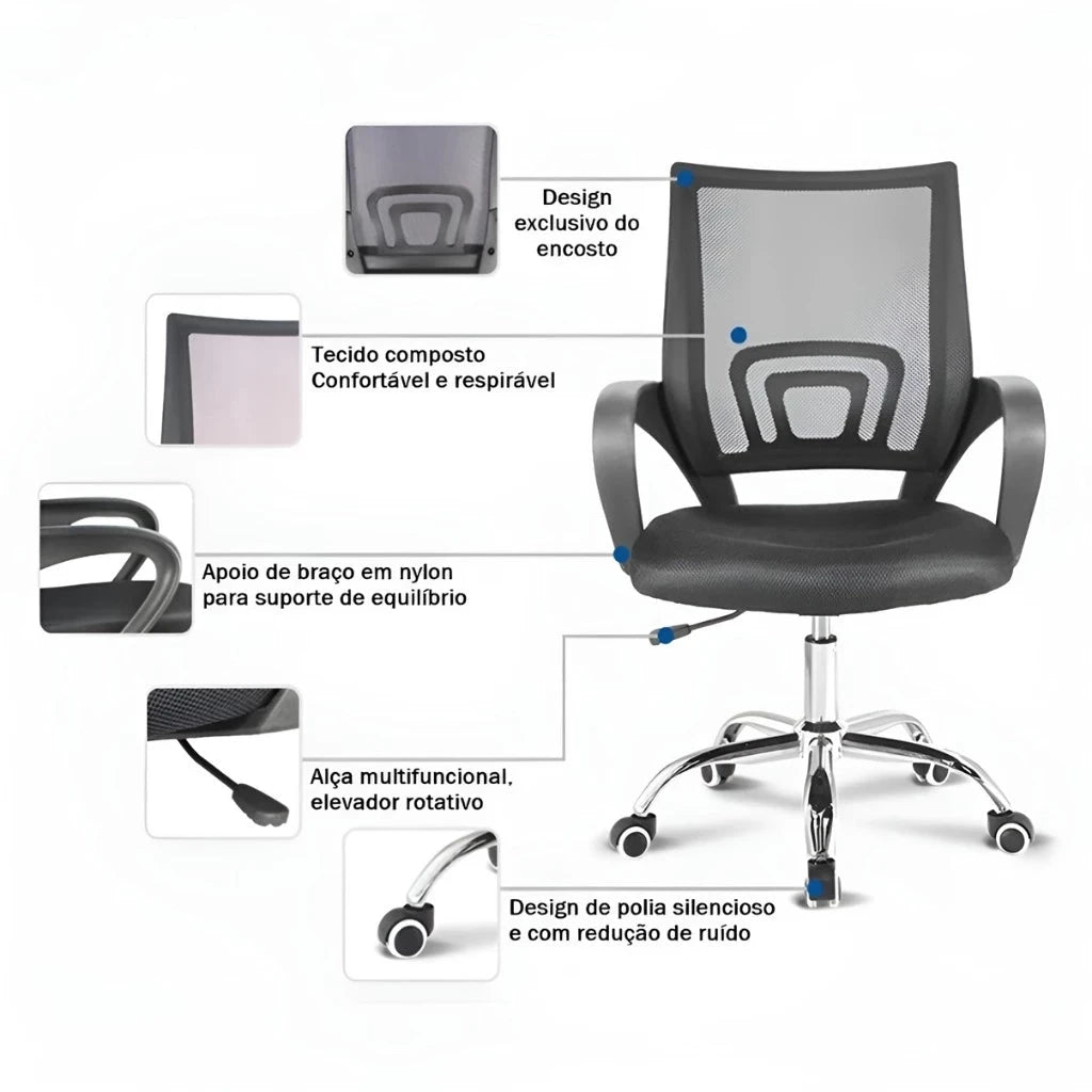 A Cadeira de Escritório com Encosto em Tela Mesh foi projetada para quem busca conforto duradouro e saúde postural mesmo após horas de trabalho. O encosto em tela mesh garante ventilação contínua, evitando calor excessivo e suor nas costas, enquanto o design ergonômico promove uma postura correta e confortável.