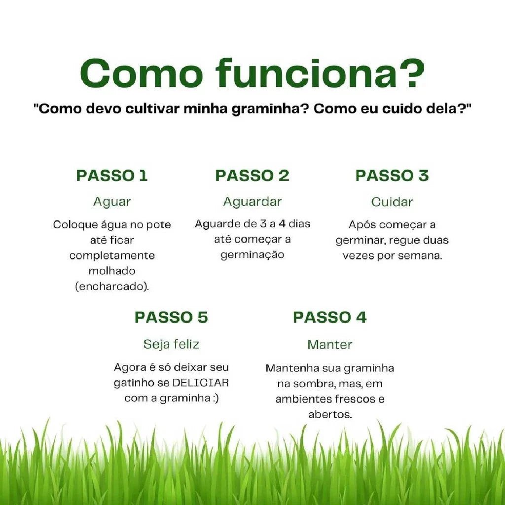 A graminha vem com sementes e pote. Basta adicionar água e, em poucos dias, ela estará crescida e pronta para ser aproveitada. É um mini jardim que cabe em qualquer canto da casa!